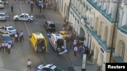 В субботу в центре Москвы, на улице Ильинка, водитель такси выехал на тротуар и совершил наезд на группу пешеходов. За медицинской помощью обратились по меньшей мере 8 человек. Среди них - две гражданки Мексики. Они были одеты в цвета национального мексиканского флага, сообщает агентство Reuters.