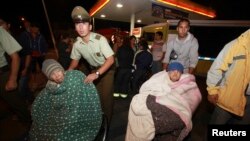 На фотографиях, сделанных в зоне землетрясения, видно, как чилийцы спокойно покидают прибрежные районы пешком, полицейские помогают укутанным в одеяла пожилым людям, а некоторые местные жители загружают свои вещи в машину.